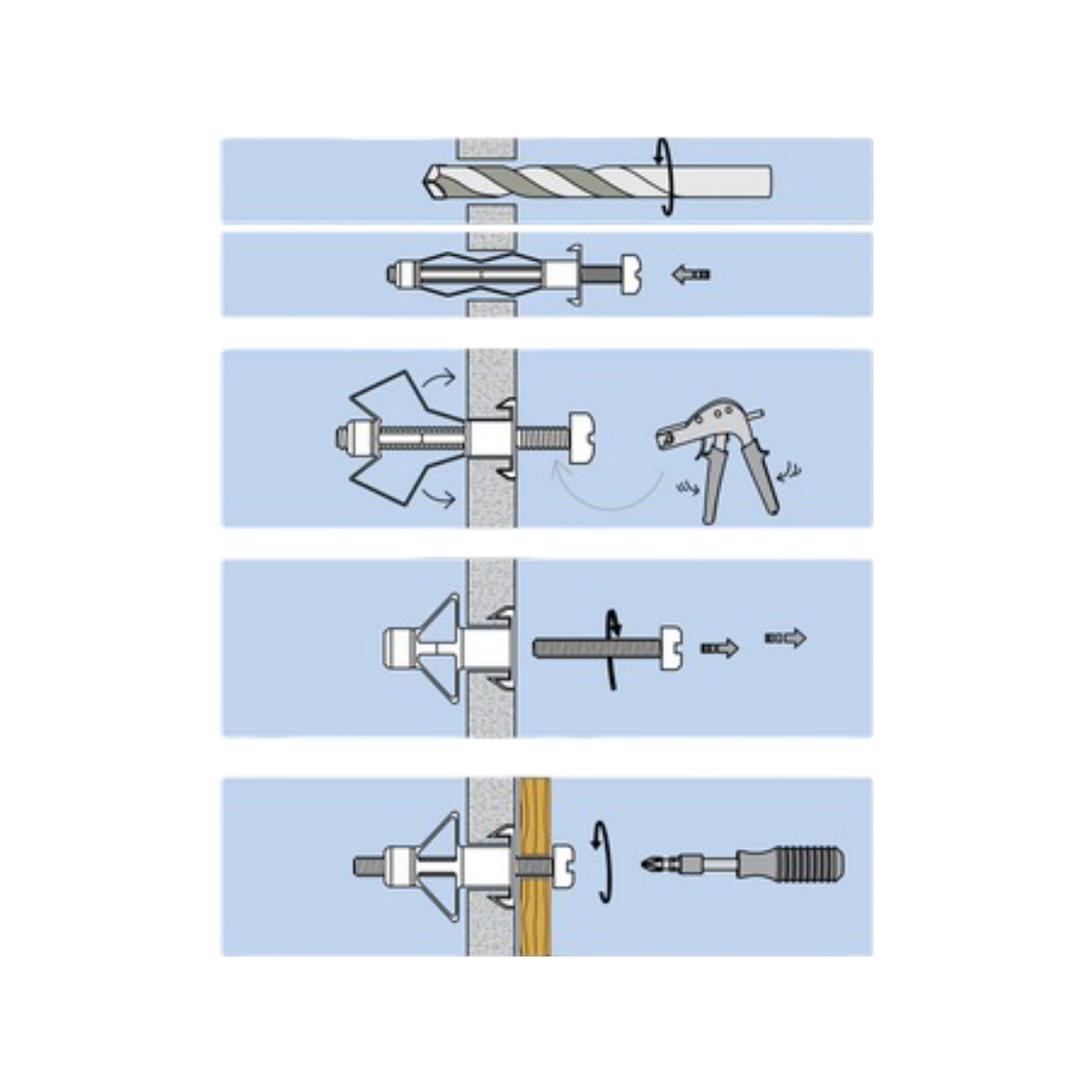 Βύσμα με επεκτεινόμενους βραχίονες που εξασφαλίζουν μεγάλη ικανότητα στερέωσης. Εύκολη τοποθέτηση με κατσαβίδι ή εργαλείο. Η βίδα μπορεί να αφαιρεθεί χωρίς να χαθεί η δύναμη συγκράτησης. Η ροδέλα καλύπτει πιθανές ατέλειες.