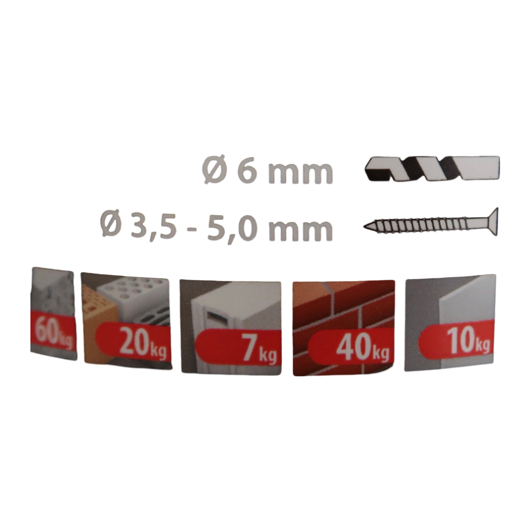 Βύσμα κατάλληλο για τα περισσότερα δομικά υλικά. Οι βίδες βιδώνονται πολύ εύκολα χάριν της γεωμετρίας του βύσματος. Η ροδέλα προστατεύει την επιφάνεια του τοίχου και αποτρέπει την ολίσθηση στην οπή. Οι 4 σχισμές με τα πτερύγια πετυχαίνουν ομοιόμορφη κατανομή δύναμης. Επεκτείνεται ή γίνεται κόμπος ανάλογα με το δομικό υλικό.